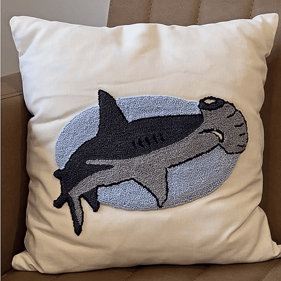 Özel elle işlenmiş Çekiç baş köpekbalığı desenli minder.